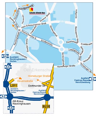 A43, Ausfahrt "Recklinghausen/Herten/Oer-Erkenschwick". L511 Richtung Oer-Erkenschwick (-> Devensstraße), an der 1. Ampel links Richtung Oer abbiegen auf die Recklinghäuser Str.
